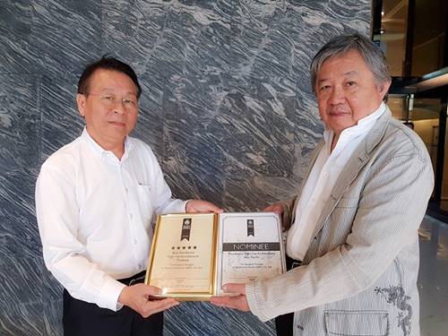 Representing Land and Houses Plc, Mr. Adul Chuvanichanon, Deputy Managing Director (left), accepted a project design award from Mr. Boonsong Pitakraksanti, Chairman, Tandem Architects (2001) Co., Ltd., for The Bangkok Thonglor condominium project. Tandem Architects (2001) designed this project, which has landed three International Property Awards, namely AWARD WINNER – Residential High-Rise Architecture Thailand, Best – Residential High-Rise Architecture Thailand, and NOMINEE / Residential High-Rise Architecture Asia Pacific.