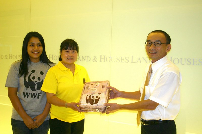 Khun Chokchai Walitwarangkoon, Land and Houses' Vice President, is seen receiving a souvenir from Khun Duangduen Eagan, Marketing and Fundraising Manager of WWF Thailand in recognition of Land and Houses' being a member of WWF Thailand to support the natural resources conservation in Thailand.