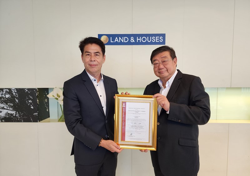 Mr. Wit Tantiworawong, Managing Director, Land and Houses Plc (right), recently received an ISO 14064-1:2018 management system certificate from Mr. Prawaltong Tongyai Na Ayudhaya, Certification Manager Thailand / Myanmar / Laos / Cambodia, Bureau Veritas Certification (Thailand) Co., Ltd. (left). ISO 14064:1:2018 represents international verification for measuring and reporting corporate greenhouse gas (GHG) emissions and reduction. Land and Houses in 2022 began developing and disclosing business-related GHG emissions, paving the way for the formulation of a management approach under its climate change policy. Such emission data have undergone verification by Bureau Veritas Certification (Thailand) and have duly been accredited with ISO 14064-1:2018.