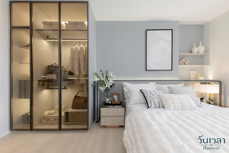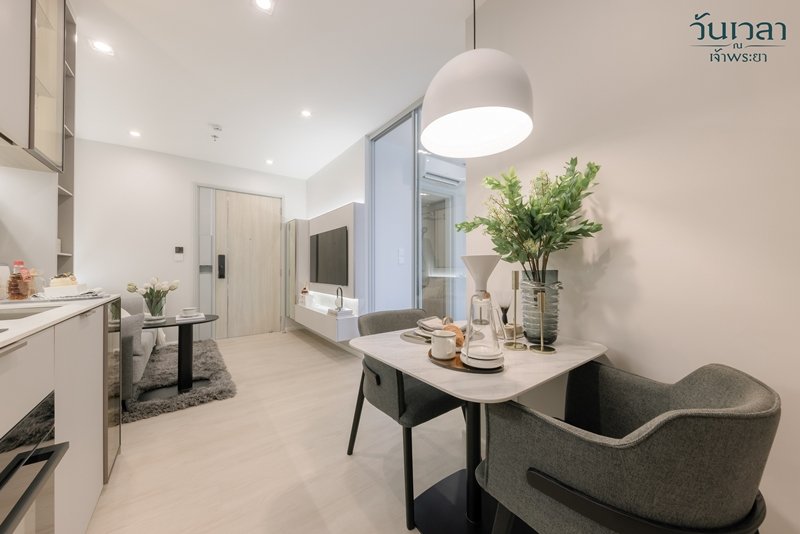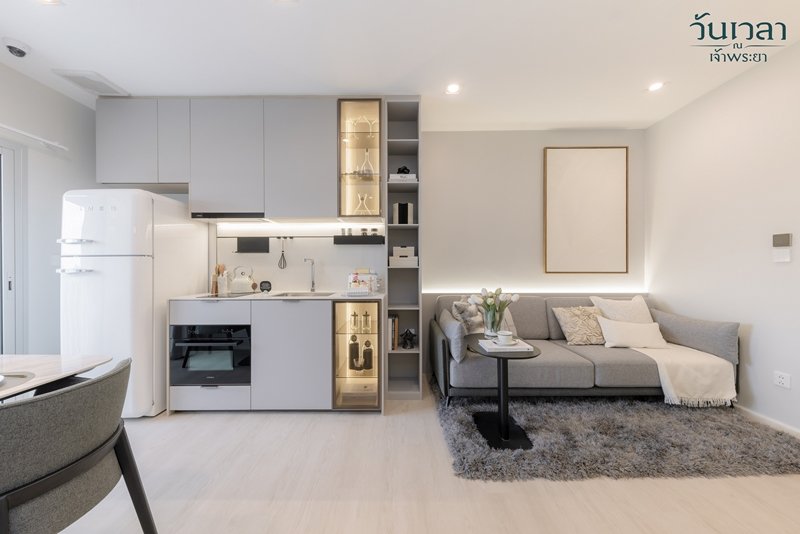 Wan Vayla Na Chaophraya will be opening for booking units with river views and showcasing new sample rooms at Tower C, which will contain 31 floors and 466 units. All units of each wing command different splendid views of the Chao Phraya as well as unique individuality. The units come fully adorned in a modern, luxurious contemporary style, featuring well-planned segments for each function. Cozy ambience stems from bright-tone paint, which gives all units a wide-open feeling as well as elegant views. Exquisite materials are meticulously selected for each utility area. To prepare all units for occupation, the project provides a sofa, a coffee table set, and a well-designed bed equipped with chokes, complete with a five-foot mattress, with space underneath for storing items like large suitcases—thus giving extra storage space within each unit. A built-in pantry affords residents the choice of assorted cooking with a double-induction cooker, a range hood, a basin, and a microwave oven. A bookshelf of a floor-to-ceiling vertical design is not only practical but also space-saving. A built-in TV and shoe cabinet accommodates a distribution panel and electric wires; for tidiness, fiber internet wiring is also discreetly hidden. Finally, a dining table / work desk with a marble-pattern design is provided along with two contemporary-style chairs and fitted with an off-white lamp and an electric plug. All these furniture items are selected by professional interior designers, thus no budget overrun or self-decoration—residents simply move in. Prices start at 5.34 million baht.