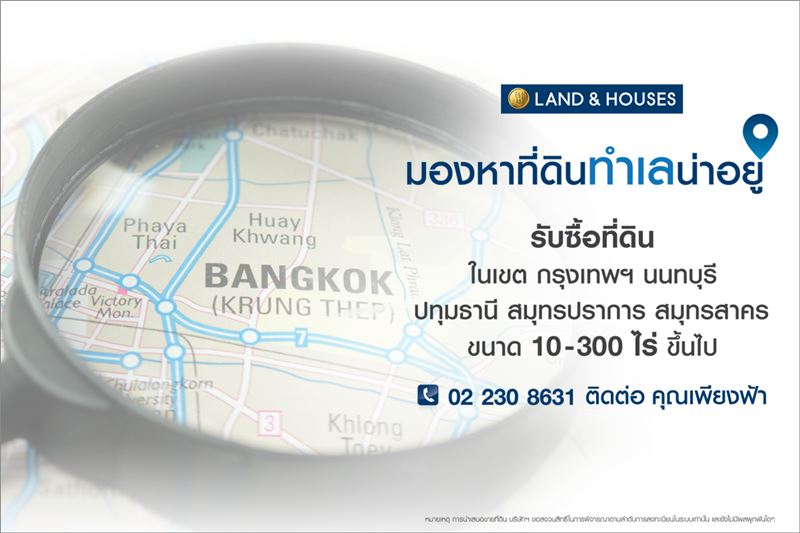 บริษัท แลนด์ แอนด์ เฮ้าส์ จำกัด (มหาชน) รับซื้อที่ดินในเขตกรุงเทพฯ นนทบุรี ปทุมธานี สมุทรปราการ และสมุทรสาคร ขนาดที่ดินตั้งแต่ 10-300 ไร่ ขึ้นไป โดยผู้ที่สนใจสามารถติดต่อคุณเพียงฟ้า ได้ที่โทร. 02 230 8631 หรือคลิกลงทะเบียนเสนอขายที่ดินได้ที่ https://land-for-sale.lh.co.th/