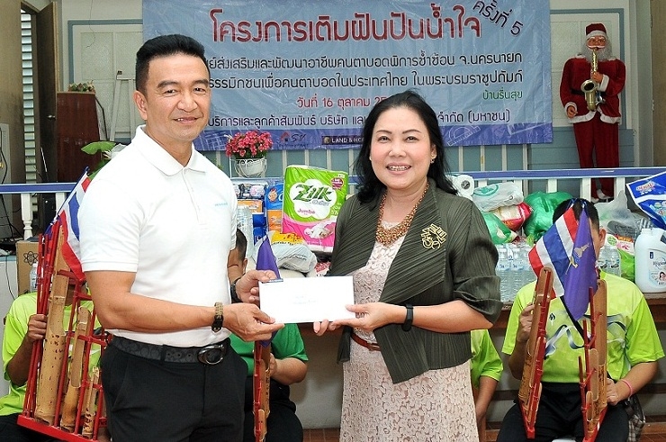 คุณสมเกียรติ ยินดีสมปอง ผู้จัดการฝ่ายบริการและลูกค้าสัมพันธ์ บริษัท แลนด์ แอนด์ เฮ้าส์ จำกัด (มหาชน) เป็นตัวแทนมอบเงินบริจาคจำนวน 130,000 บาท พร้อมสิ่งของใช้ที่จำเป็นต่างๆ ให้แก่ คุณอัญชลี ชัยทรัพย์ กรรมการดำเนินงานมูลนิธิธรรมิกชนเพื่อคนตาบอดในประเทศไทย สาขานครนายก ซึ่งเป็นตัวแทนรับมอบ ณ ศูนย์ส่งเสริมและพัฒนาอาชีพคนตาบอดพิการซ้ำซ้อน จ.นครนายก มูลนิธิธรรมิกชนเพื่อคนตาบอดในประเทศไทย ในพระบรมราชูปถัมภ์ (บ้านรื่นสุข) เมื่อวันที่ 16 ตุลาคม 2562