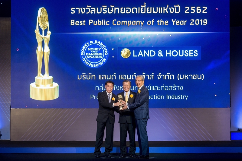 คุณอดิศร ธนนันท์นราพูล (ซ้าย) กรรมการผู้จัดการ บ. แลนด์ แอนด์ เฮ้าส์ จำกัด (มหาชน) เป็นผู้แทนบริษัทฯ รับรางวัลเกียรติยศ บริษัทยอดเยี่ยมแห่งปี 2562 กลุ่มอสังหาริมทรัพย์และก่อสร้าง จากดร.สมคิด จาตุศรีพิทักษ์ (ขวา) รองนายกรัฐมนตรี ซึ่งให้เกียรติเป็นประธานมอบรางวัลในงาน MONEY & BANKING AWARDS 2019 จัดขึ้นโดยวารสารการเงินธนาคาร โดยมี คุณสันติ วิริยะรังสฤษฎ์ (กลาง) ประธานบรรณาธิการ วารสารการเงินธนาคาร ร่วมในพิธีมอบรางวัล โดยรางวัลบริษัทยอดเยี่ยมแห่งปีนั้นพิจารณาจากผลประกอบการในปี 2561 ของบริษัทจดทะเบียนใน แต่ละกลุ่มอุตสาหกรรม