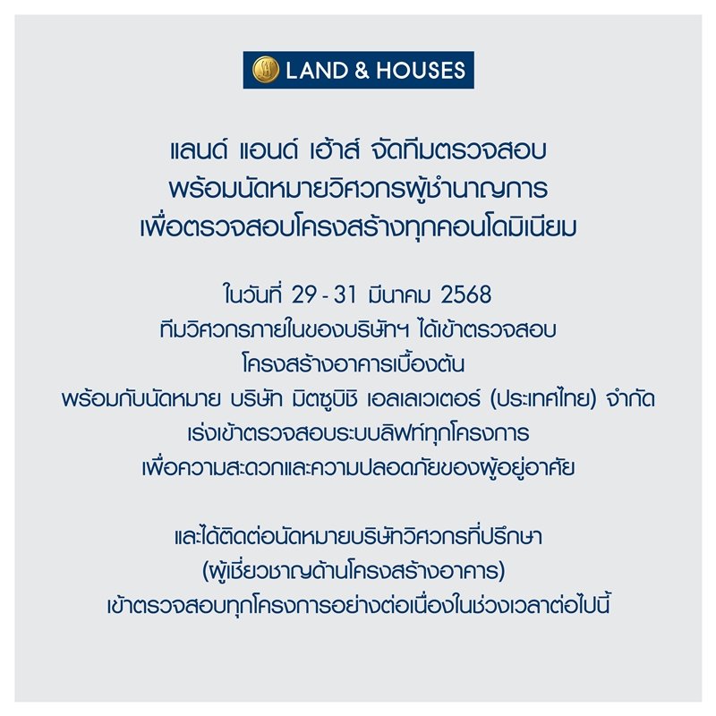 จากเหตุการณ์แผ่นดินไหวเมื่อบ่ายวันศุกร์ที่ 28 มีนาคมที่ผ่านมา ซึ่งมีความรุนแรงที่สามารถสร้างความเสียหายต่ออาคารสูง คอนโดมิเนียม และที่พักอาศัยในหลายพื้นที่และยังสร้างความกังวลให้กับผู้อยู่อาศัยในเรื่องความปลอดภัยนั้น บริษัท แลนด์ แอนด์ เฮ้าส์ จำกัด (มหาชน) ตระหนักถึงความสำคัญในเรื่องของการอยู่อาศัยที่ปลอดภัยของลูกบ้าน ได้ดำเนินการจัดทีมตรวจสอบ พร้อมนัดหมายวิศวกรผู้ชำนาญการเพื่อตรวจสอบโครงสร้างอาคารทุกคอนโดมิเนียม โดยในวันที่ 29 - 31 มีนาคม 2568 ทีมวิศวกรภายในของบริษัทฯ ได้เข้าตรวจสอบโครงสร้างอาคารเบื้องต้น พร้อมกับนัดหมายบริษัท มิตซูบิชิ เอลเลเวเตอร์ (ประเทศไทย) จำกัด ให้เร่งเข้าตรวจสอบระบบลิฟท์ทุกโครงการ เพื่อความสะดวกและความปลอดภัยของผู้อยู่อาศัย และได้ติดต่อนัดหมายบริษัทวิศวกรที่ปรึกษา (ผู้เชี่ยวชาญด้านโครงสร้างอาคาร) ให้เข้าตรวจสอบทุกโครงการอย่างต่อเนื่องในช่วงเวลาต่อไปนี้