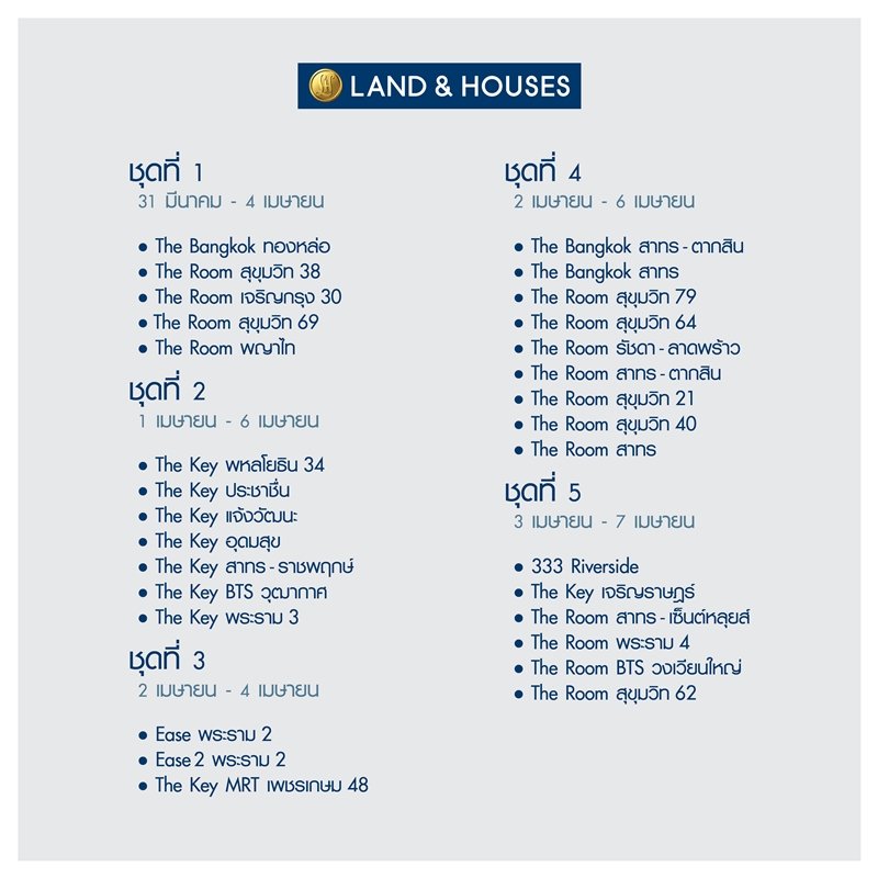 - ชุดที่ 5 ช่วงวันที่ 3 เมษายน - 7 เมษายน : โครงการ 333 Riverside, The Key เจริญราษฎร์, The Room สาทร - เซ็นต์หลุยส์, The Room พระราม 4, The Room BTS วงเวียนใหญ่, The Room สุขุมวิท 62